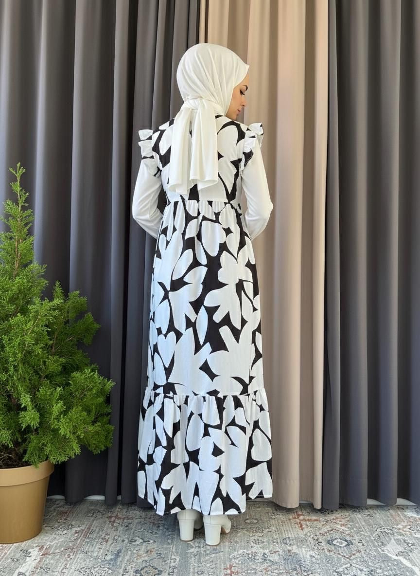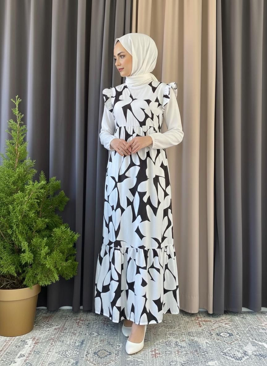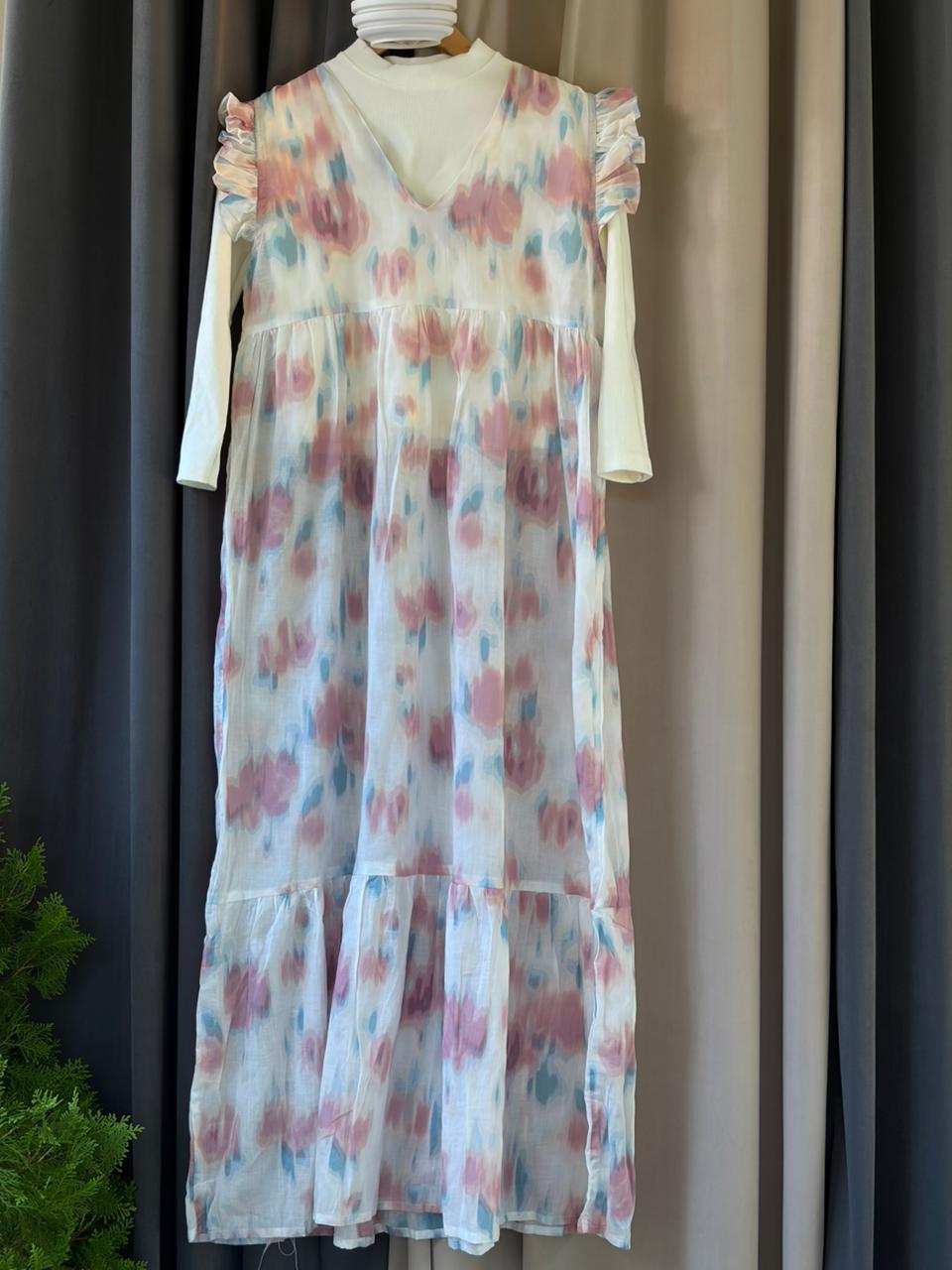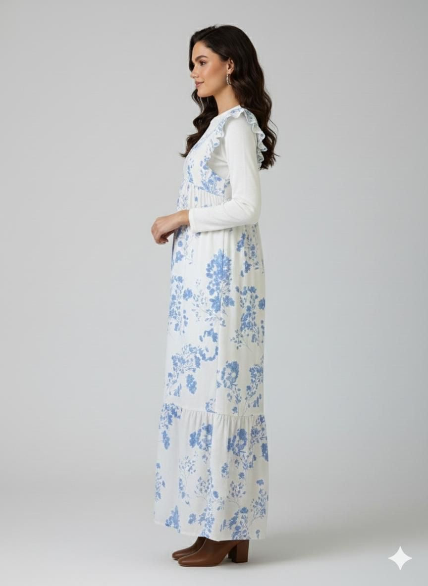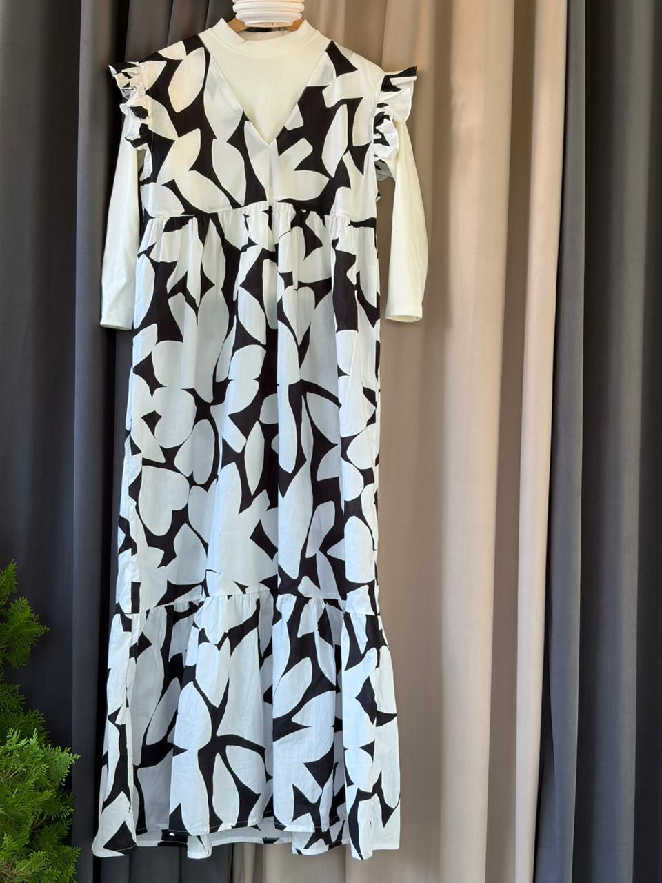 An elegant and trendy Two-Piece Layering Set featuring a long-sleeve, high-neck white inner top paired with a flowy, tiered V-neck sleeveless maxi dress (or outer slip dress). The maxi dress has ruffled cap sleeves and a voluminous silhouette, available in three distinct prints: