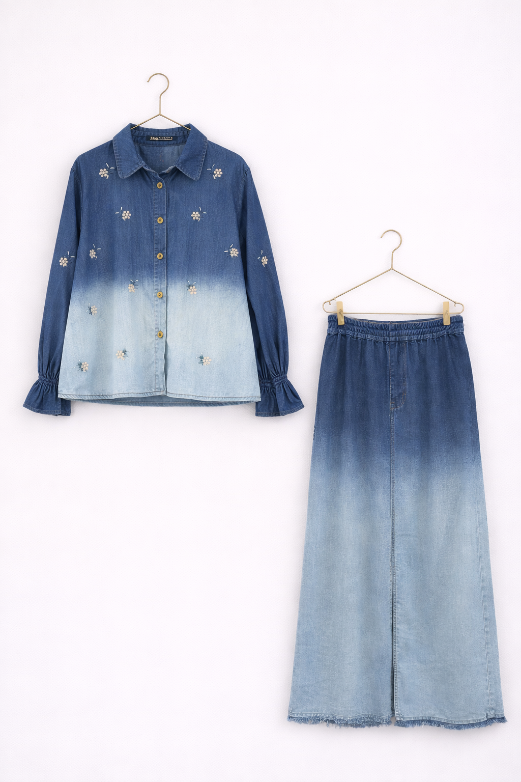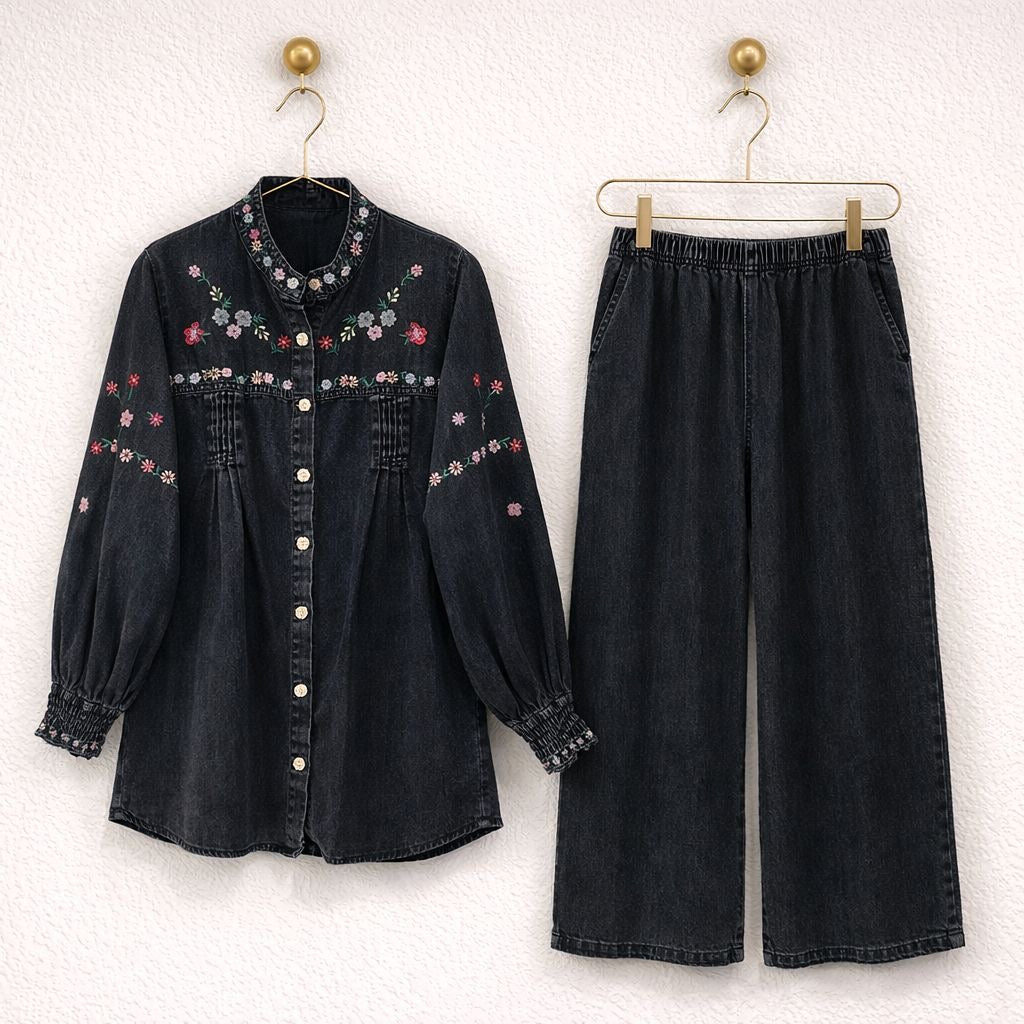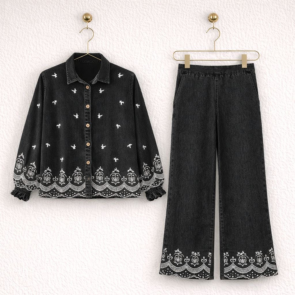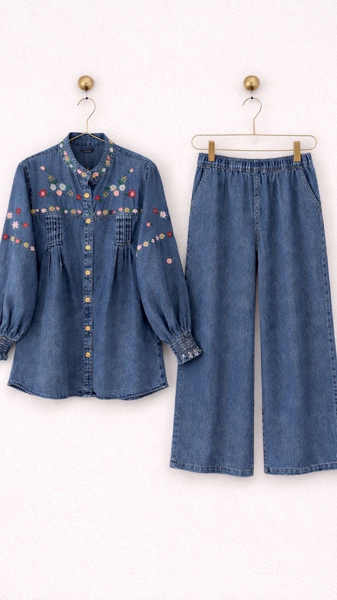 Embroidered Denim Co-Ord Set | Shirt & Wide-Leg Pants