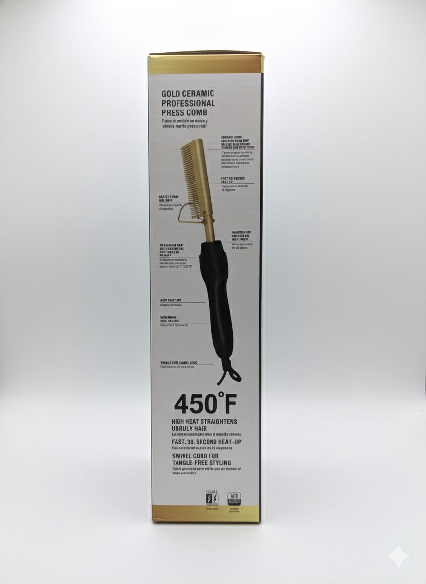 • Gold Ceramic Technology: The ceramic comb transfers heat evenly and effectively, helping to lock in moisture, reduce frizz, and create brilliant shine without damaging the hair.