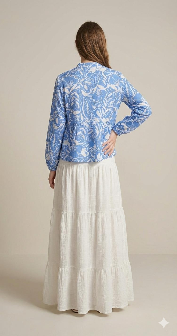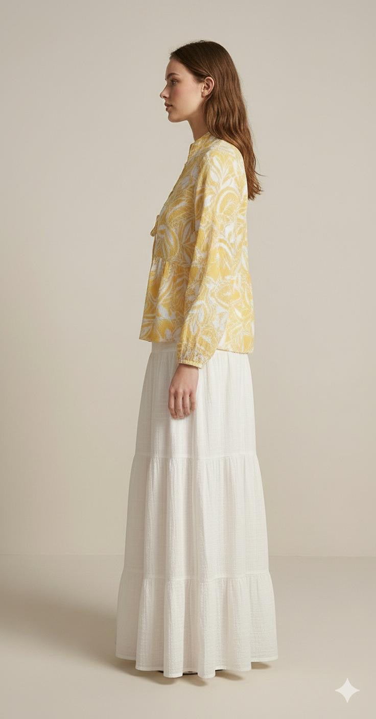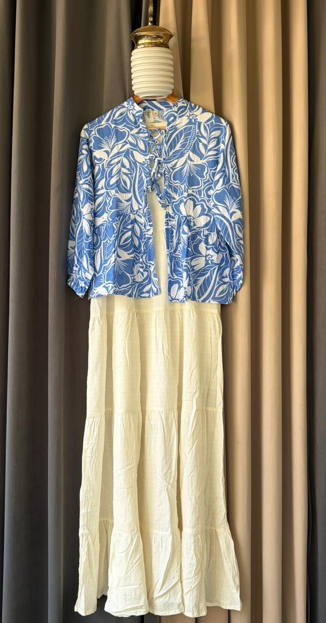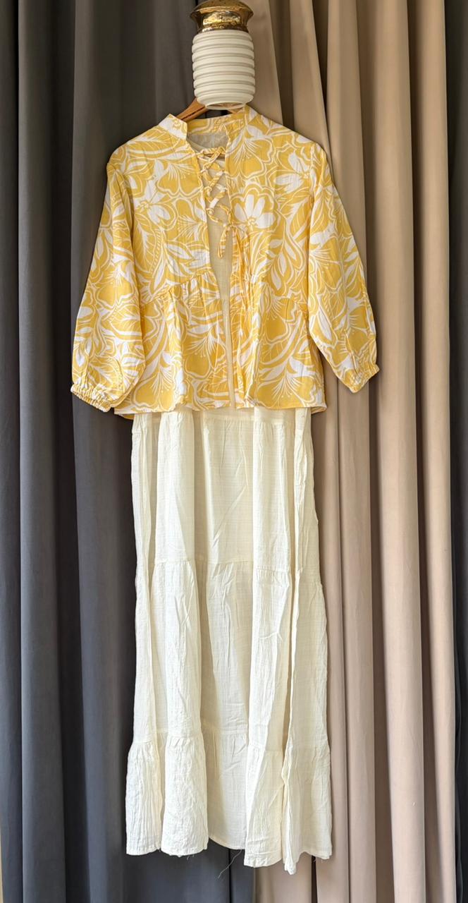 This breezy two-piece ensemble is perfect for a warm-weather look. It features a cropped, open jacket or blouse with a vibrant tropical or floral print (available in Sunny Yellow or Ocean Blue) and three-quarter length, slightly voluminous sleeves. The top has a stand collar with a drawstring or lace-up detail. It is paired with a floor-length, cream or off-white tiered maxi skirt made of a crinkled or textured lightweight fabric. This set offers a chic, comfortable outfit for vacations, beach trips, or summer outings.